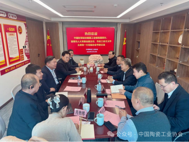 2月18日,中国陶瓷工业协会刘挺理事长会见淄博市人大常委会副主任、市总工会王义朴主席一行7人,双方就推动淄博市陶瓷产业发展和职业技能人才培养进行了会谈。中国财贸轻纺烟草工会全国委员会轻工烟草工作部部长杨栋国,中国陶瓷工业协会常务副理事长吴越申、副理事长侯文全、秘书长樊瑞新出席会谈。