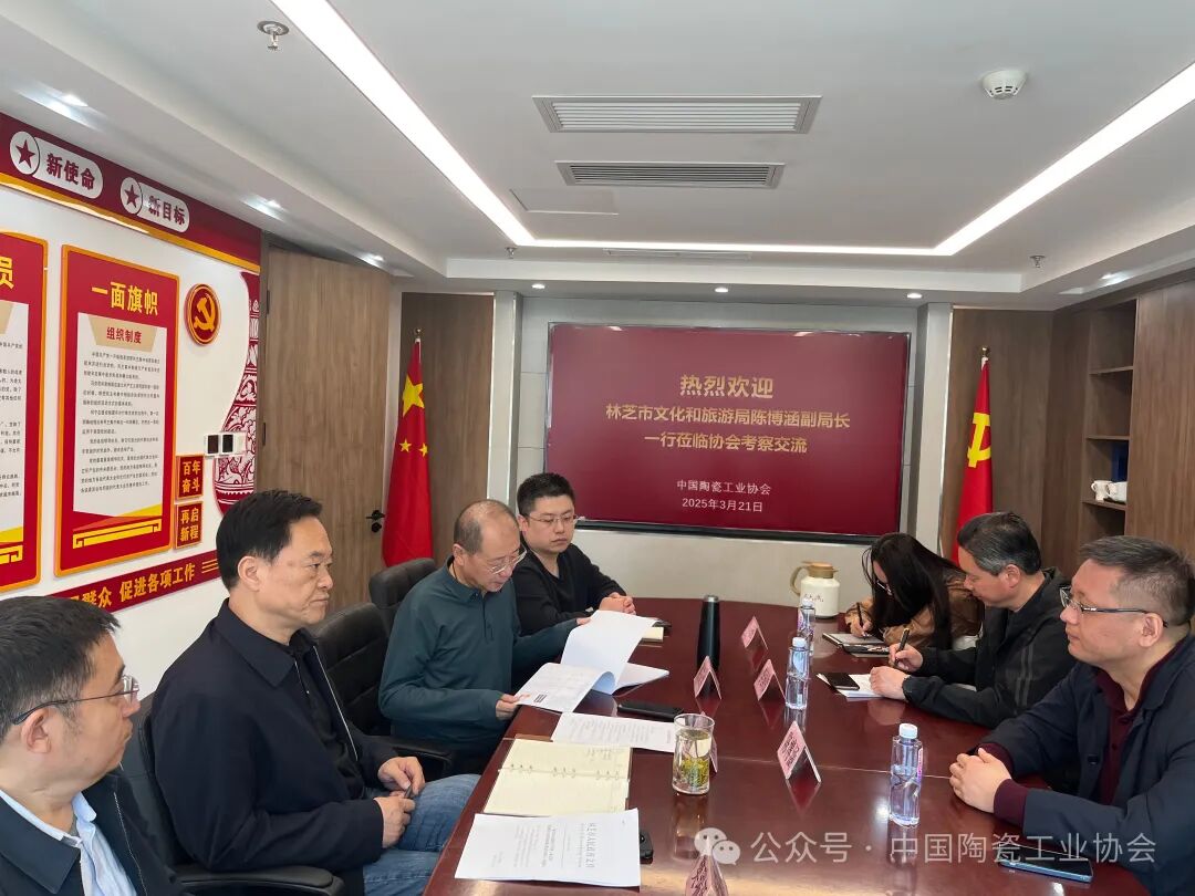 3月21日,林芝市陈博涵副市长一行到访中国陶瓷工业协会,双方围绕文化旅游资源开发、文创产品创新及产业合作等议题展开深入交流。协会常务副理事长吴越申主持座谈,副理事长侯文全、秘书长樊瑞新出席座谈。