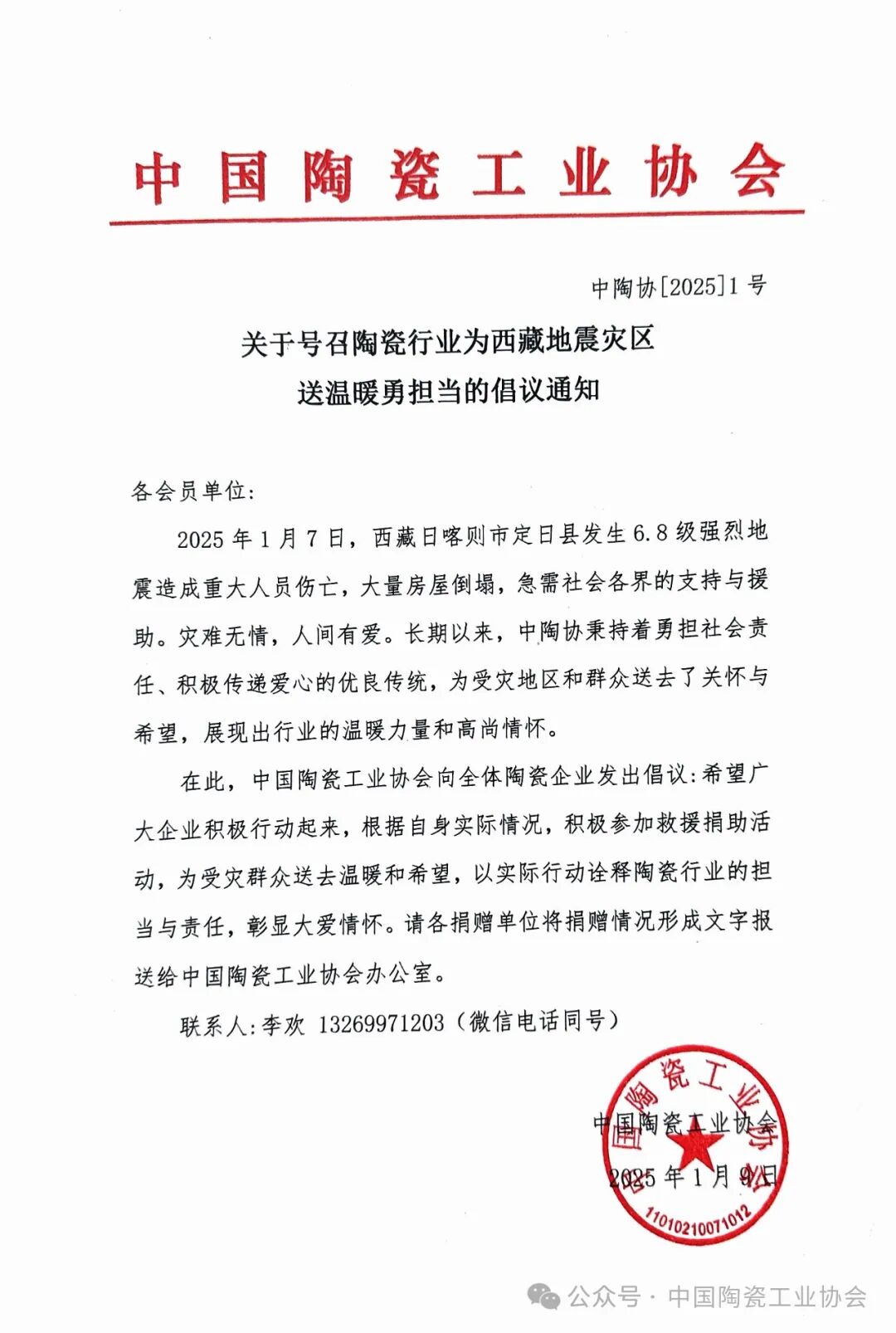 2025年1月7日,西藏日喀则市定日县发生6.8级强烈地震造成重大人员伤亡,大量房屋倒塌,急需社会各界的支持与援助。灾难无情,人间有爱。长期以来,中陶协秉持着勇担社会责任、积极传递爱心的优良传统,为受灾地区和群众送去了关怀与希望,展现出行业的温暖力量和高尚情怀。在此,中国陶瓷工业协会向全体陶瓷企业发出倡议:希望广大企业积极行动起来,根据自身实际情况,积极参加救援捐助活动,为受灾群众送去温暖和希望,以实际行动诠释陶瓷行业的担当与责任,彰显大爱情怀。请各捐赠单位将捐赠情况形成文字报送给中国陶瓷工业协会办公室。联系人:李欢 13269971203(微信电话同号)